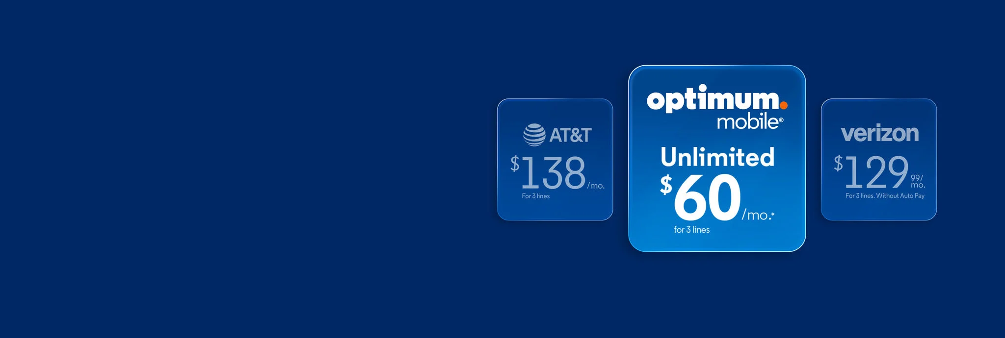 $15/mo. per line for 1 GB data, unlimited talk & text. Autopay required. New Optimum Mobile lines only, cannot be applied to existing lines of service. Other monthly charges apply per line, including $25 activation fee, and may include roaming charges, taxes, government fees and other Optimum Mobile fees and surcharges (including USF fee). Other terms and conditions apply; visit www.optimum.com/mobile/plan for plan details.